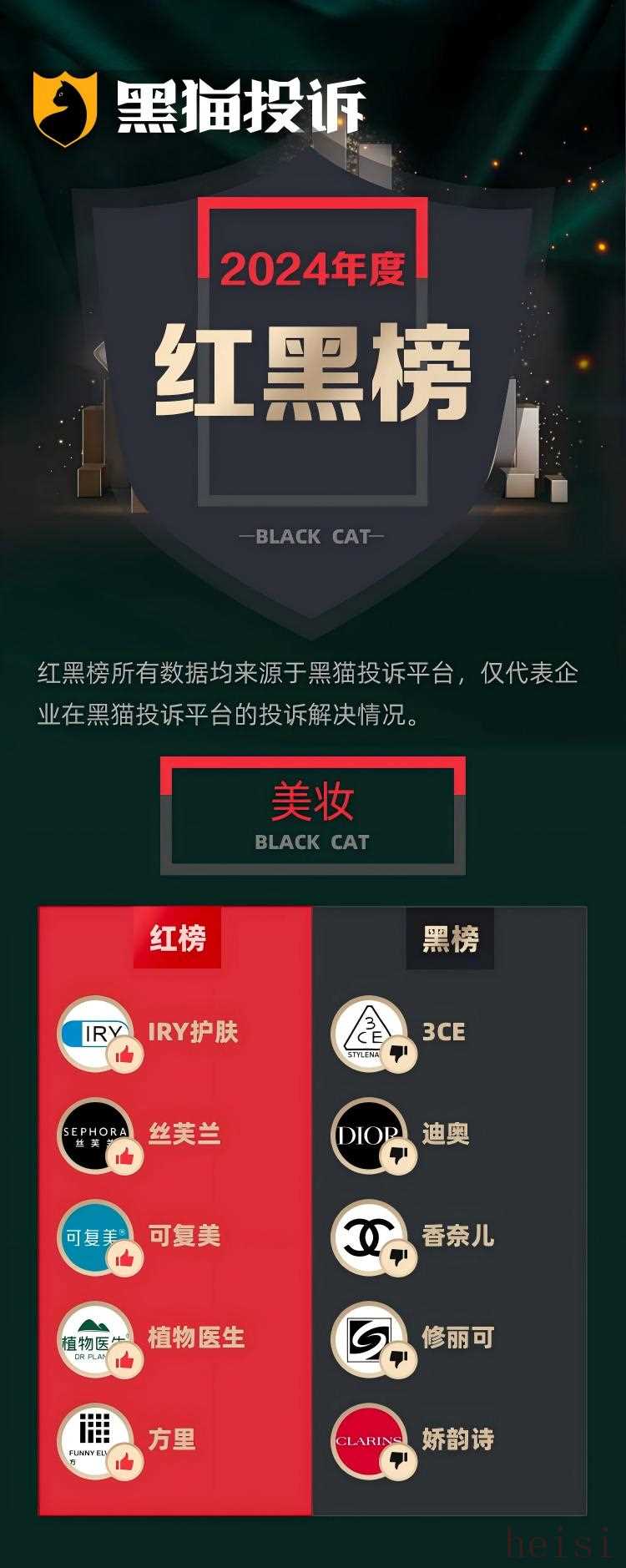 黑貓投訴平臺3月3日發(fā)布2024年度企業(yè)紅黑榜榜單,涉及游戲、影音直播、網(wǎng)上商城等17大領域,通過“有效投訴量”“回復量+確認完成量”“回復率”“完成率”“響應時間”“初始分配時間”等多個維度的影響因子計算權重得出排行,客觀反映企業(yè)2024年投訴處理情況。其中美妝領域紅黑榜榜單中,黑榜前五名上榜品牌分別是3CE、Dior迪奧、Chanel香奈兒、修麗可和嬌韻詩,國際美妝大牌成為投訴“重災區(qū)”,其中3CE和修麗可均屬于歐萊雅集團。