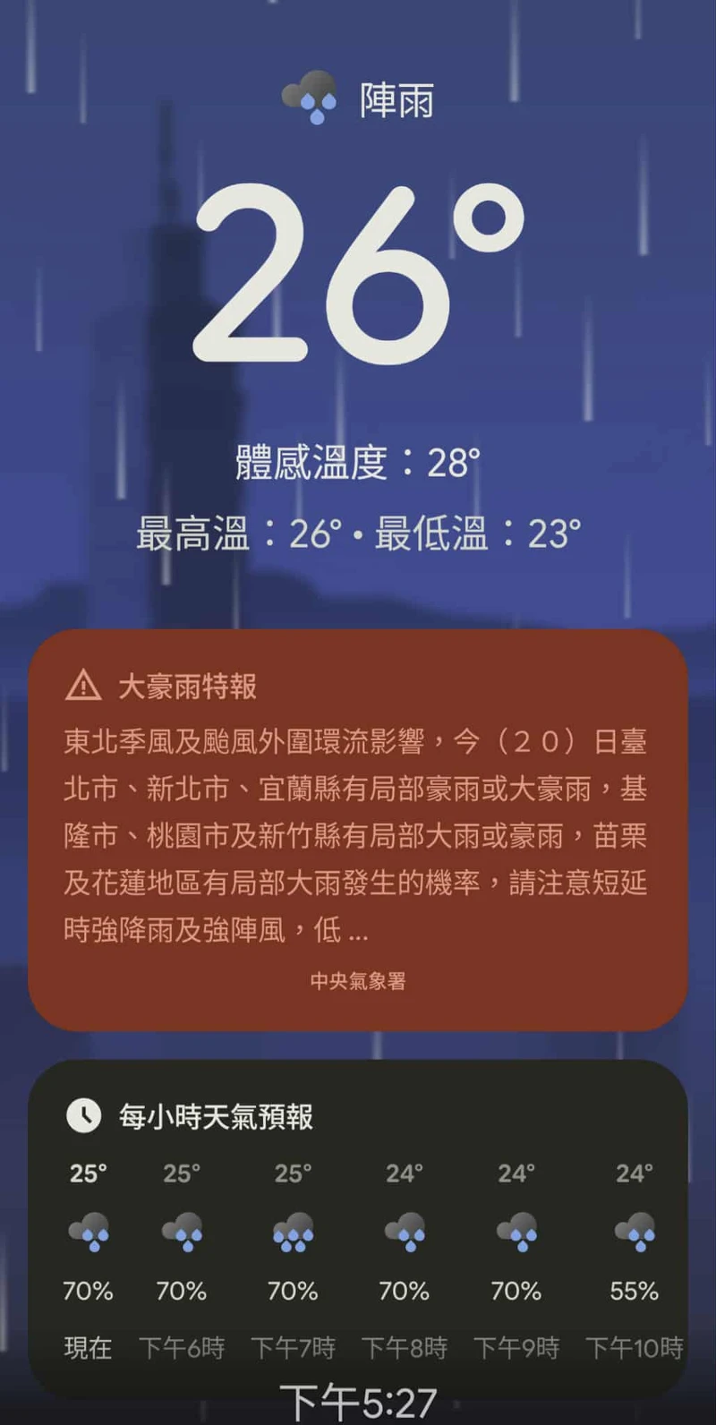 另外在待機模式時也會貼心顯示天氣資訊,如中央氣象署提供10/20的,在動態(tài)大雨背景外更有文字訊息、每小時天氣及氣溫預(yù)報,免解鎖也能一目了然。