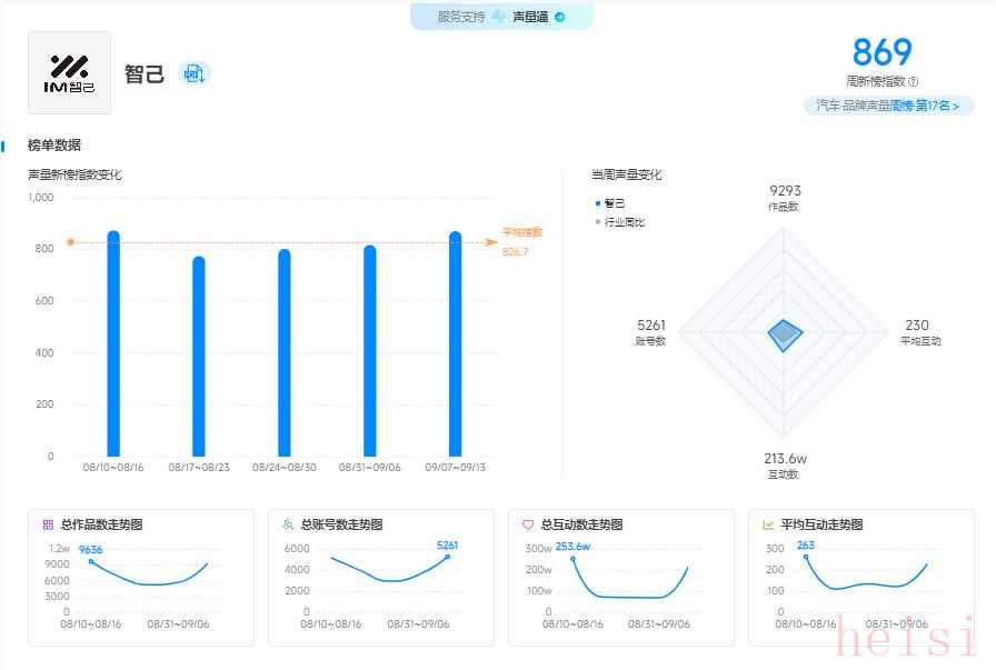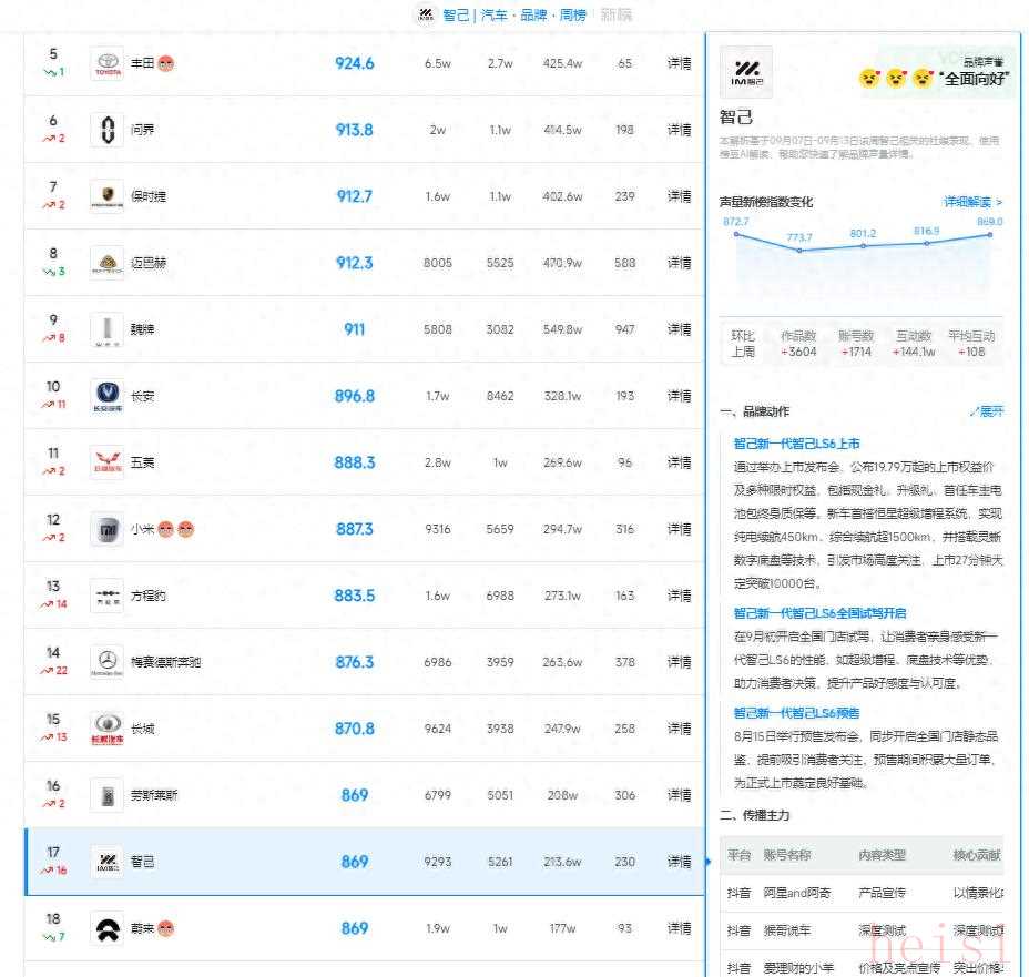 新榜品牌聲量?汽車周榜(09 月 07 - 09 月 13 日)發(fā)布,智己汽車以 869 的聲量新榜指數(shù)位居第十七 。環(huán)比上周,排名上升16名,作品數(shù)增加 5604,互動(dòng)量提升 144.1w ,憑借一系列有力的品牌動(dòng)作,在汽車市場中成功吸引了大量關(guān)注。