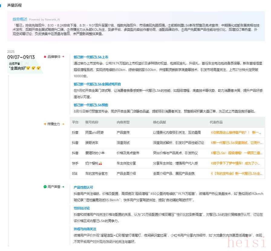 "總結(jié)來說:" 智己汽車通過發(fā)布新一代LS6這款重要產(chǎn)品,成功提升了其在市場上的關(guān)注度和影響力,品牌聲量達(dá)到了一個(gè)新的高度(800)。
