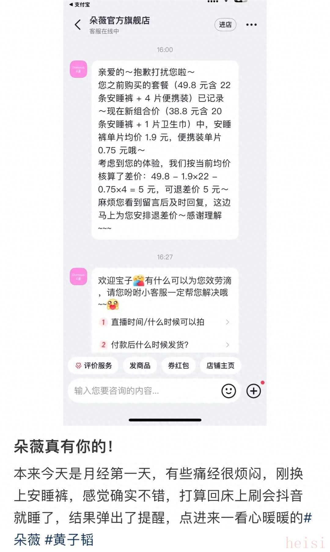 一名5月19日在直播間下單的消費者在6月5日收到了朵薇客服聯(lián)系她退差價的消息。她曬出的客服溝通記錄顯示,她此前以49.8元的價格購買的套餐包含22條安睡褲及4片便攜裝?,F(xiàn)在新組合價(38.8元含20條安睡褲及1片衛(wèi)生巾)中,安睡褲單片均價1.9元,便攜裝單片0.75元??头硎?,考慮到消費者的體驗,按照當前均價核算了差價,可退差價5元。該消費者表示,看到消息心暖暖的,已經收到了退款。