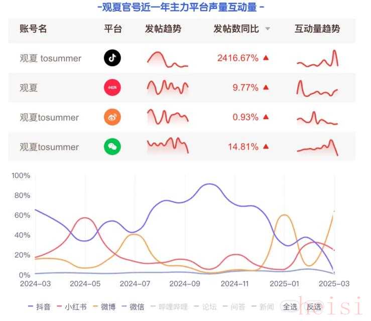 東方生活美學香氛品牌觀夏(To Summer),不再依賴傳統(tǒng)電商的大促節(jié)奏,而是將“內(nèi)容即產(chǎn)品”作為核心營銷邏輯。品牌將東方美學內(nèi)化為產(chǎn)品語言,以“昆侖煮雪”“書院蓮池”等命名觸發(fā)用戶情感記憶,同時通過公眾號與小紅書等私域內(nèi)容運營,以第一人稱書寫日常,建立一種近似“人格體”的品牌互動方式。據(jù)數(shù)說聚合數(shù)據(jù)顯示,近一年來觀夏品牌的互動熱度超1434萬,同比增長86%,聲量同比增長1.5倍。