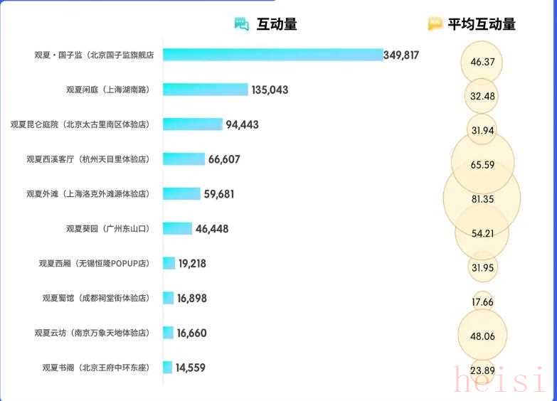 我們注意到,先前提到的觀夏同樣注重實體門店。其在上海的線下門店采用“策展式”布局,將空間劃分為詩意客廳、庭院、書閣等不同主題區(qū)域,融入東方美學和在地文化元素,營造成一種別致的生活方式氛圍。門店宛如一個微型文化展館,消費者在此不僅購物,還能參加香氛沙龍、藝術對談等活動,主動在社交媒體打卡擴散,為品牌帶來持續(xù)的社交聲量。這一做法體現(xiàn)出空間敘事的魅力:通過巧思的動線和布景,讓顧客仿佛置身于品牌故事之中。上海觀夏閑庭被UGC用戶評論“出片率極高”、“像電影場景”,收獲超13萬的互動熱度,位居Top2。觀夏葵園、觀夏西廂、觀夏外灘、觀夏書閣平均互動量領先,尤其廣州觀夏葵園今年一月線上官宣后,即有大量的用戶的參與討論,收獲高互動效率。