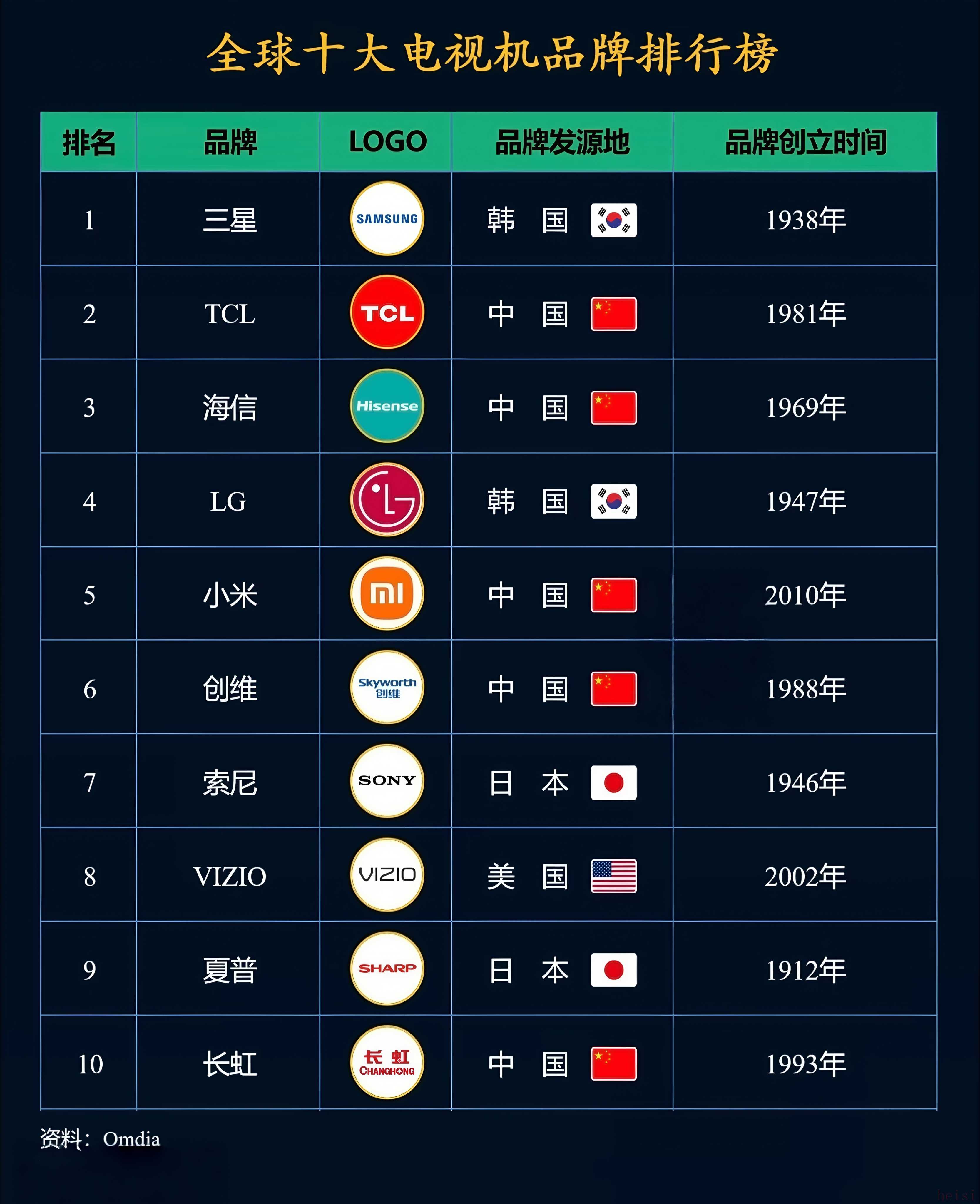 全球電視榜單里,前十名里中國(guó)品牌占了5個(gè),分別是TCL、海信、小米、創(chuàng)維以及長(zhǎng)虹!特別是TCL和海信進(jìn)前三名,挺靠前的,其中韓國(guó)三星排在第一!