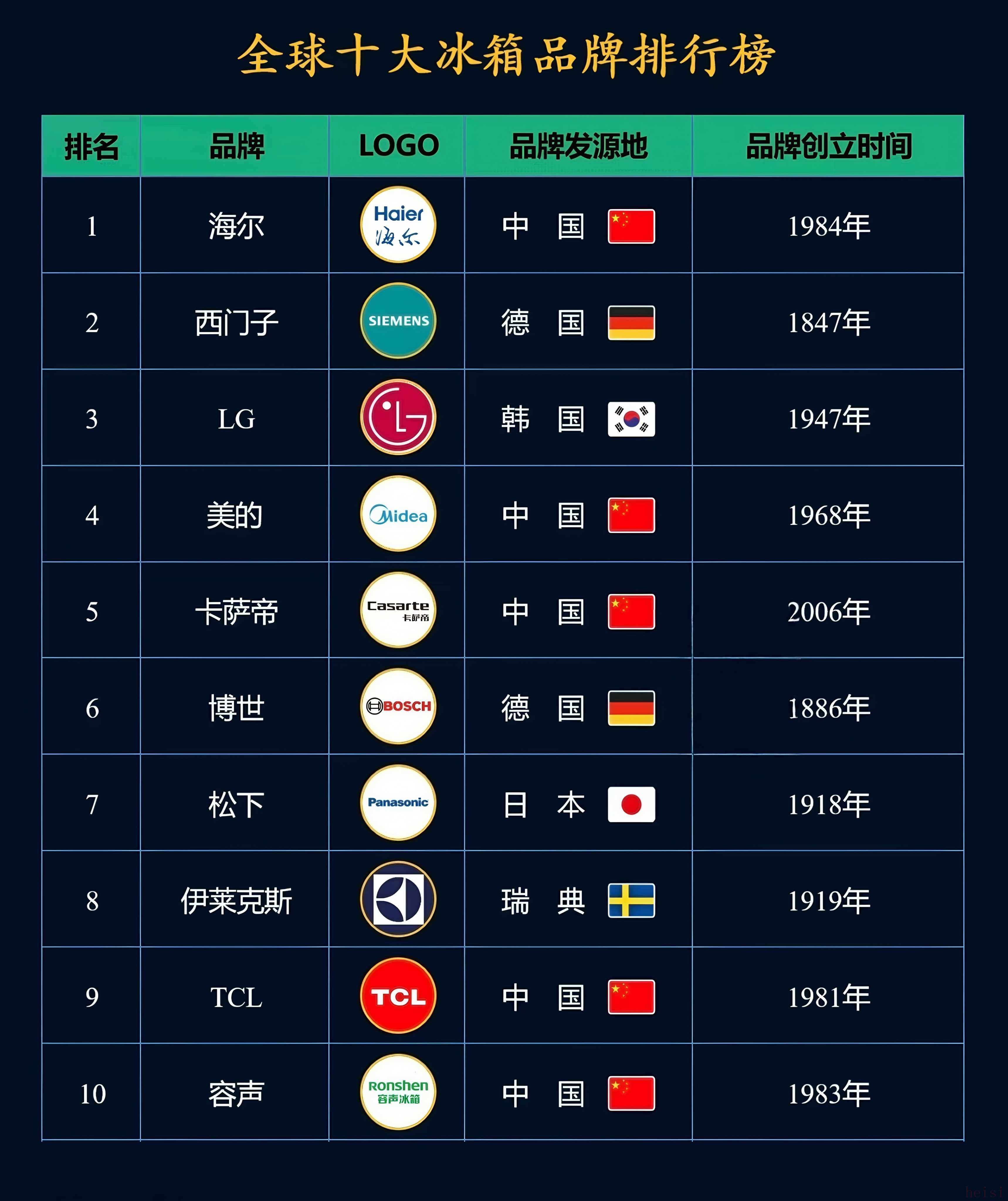 全球十大冰箱品牌榜,前十名里,咱們中國(guó)的牌子也占了5個(gè),分別是海爾、美的、卡薩帝、TCL以及容聲!