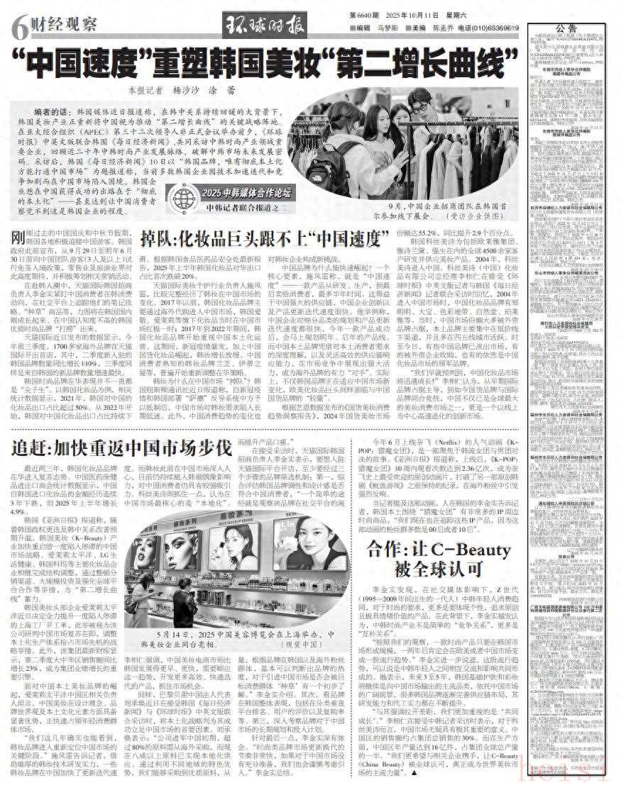 韓國(guó)媒體近日?qǐng)?bào)道稱(chēng),在韓中關(guān)系持續(xù)回暖的大背景下,韓國(guó)美妝產(chǎn)業(yè)正重新將中國(guó)視為推動(dòng)“第二增長(zhǎng)曲線(xiàn)”的關(guān)鍵戰(zhàn)略陣地。在亞太經(jīng)合組織(APEC)第三十二次領(lǐng)導(dǎo)人非正式會(huì)議舉辦前夕,《環(huán)球時(shí)報(bào)》中英文版聯(lián)合韓國(guó)《每日經(jīng)濟(jì)新聞》,共同采訪中韓時(shí)尚產(chǎn)業(yè)領(lǐng)域重要企業(yè),回顧近二十年中韓時(shí)尚產(chǎn)業(yè)發(fā)展脈絡(luò),破解中韓市場(chǎng)未來(lái)發(fā)展密碼。采訪后,韓國(guó)《每日經(jīng)濟(jì)新聞》10日以“韓國(guó)品牌,唯有徹底本土化方能打通中國(guó)市場(chǎng)”為題報(bào)道稱(chēng),當(dāng)前多數(shù)韓國(guó)企業(yè)因技術(shù)加速迭代和競(jìng)爭(zhēng)加劇而在中國(guó)市場(chǎng)陷入困境,韓國(guó)企業(yè)想在中國(guó)獲得成功的出路在于“徹底的本土化”——甚至達(dá)到讓中國(guó)消費(fèi)者察覺(jué)不到這是韓國(guó)企業(yè)的程度。