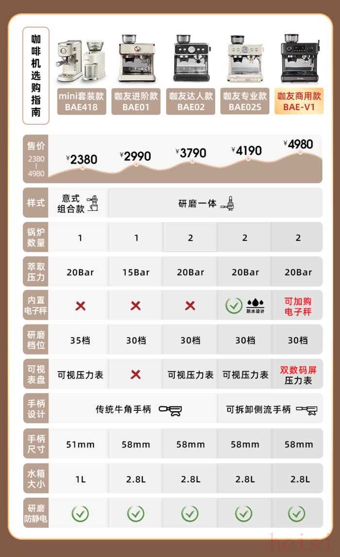 不同的是,2020年上市的BAE01為單鍋爐,一個(gè)鍋爐同時(shí)控制煮咖啡的溫度和打奶泡蒸汽的溫度,煮完咖啡打奶泡需要等待預(yù)熱20秒。BAE02推出雙鍋爐版本,煮咖啡和打奶泡可以同時(shí)進(jìn)行,互不干涉,BAE02S還在機(jī)身內(nèi)內(nèi)嵌電子秤,方便消費(fèi)者計(jì)算“粉水比”(咖啡粉和水的比值),快速制作一杯高品質(zhì)咖啡。V1則是準(zhǔn)商用的,有自動(dòng)上水、預(yù)浸泡、三孔蒸汽打奶泡等功能,還有屏幕實(shí)時(shí)顯示萃取水溫、時(shí)間和壓力。