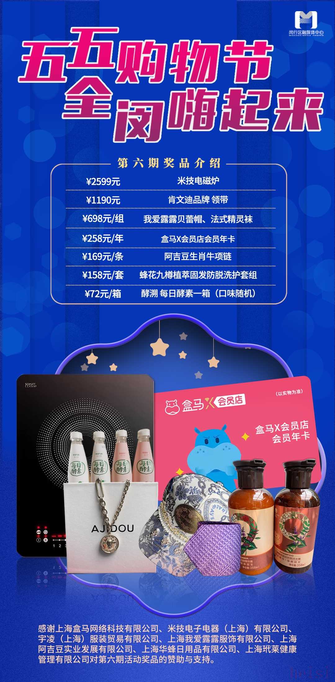 感謝上海盒馬網(wǎng)絡(luò)科技有限公司、米技電子電器(上海)有限公司、宇凌(上海)服裝貿(mào)易有限公司、上海我愛(ài)露露服飾有限公司、上海阿吉豆實(shí)業(yè)發(fā)展有限公司、上海華蜂日用品有限公司、上海玳萊健康管理有限公司對(duì)第六期活動(dòng)獎(jiǎng)品的贊助與支持。