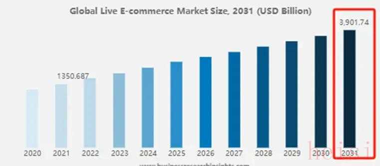 Statista有一則數(shù)據(jù)顯示,2023年美國直播電商銷售額大約為500億美元,預計未來三年將持續(xù)增長36%。BusinessResearch的數(shù)據(jù)也指出,2021年至2031年,全球直播電商市場規(guī)模的復合年增長率大概為11.28%,2031年該市場規(guī)模預計將達39017.4億美元。