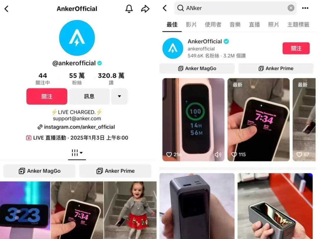 在TikTok平臺上,Anker官方賬號已擁有55萬粉絲。同時,Anker還搭建多個賬號矩陣,累計總粉絲數(shù)超百萬。
