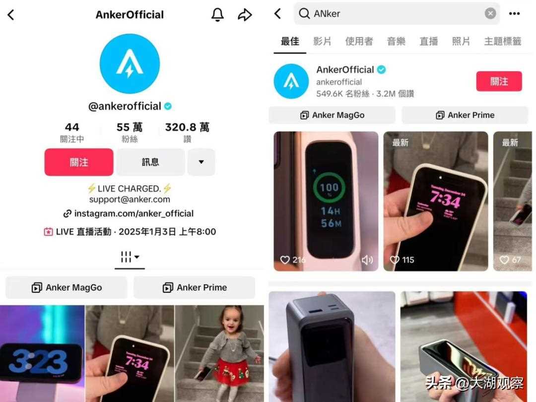 在TikTok平臺(tái)上,Anker官方賬號(hào)已擁有55萬粉絲。同時(shí),Anker還搭建多個(gè)賬號(hào)矩陣,累計(jì)總粉絲數(shù)超百萬。
