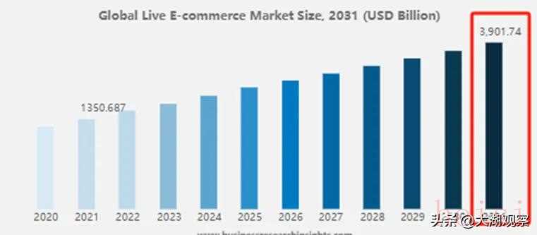 Statista有一則數(shù)據(jù)顯示,2023年美國直播電商銷售額大約為500億美元,預(yù)計(jì)未來三年將持續(xù)增長36%。Business Research的數(shù)據(jù)也指出,2021年至2031年,全球直播電商市場規(guī)模的復(fù)合年增長率大概為11.28%,2031年該市場規(guī)模預(yù)計(jì)將達(dá)39017.4億美元。