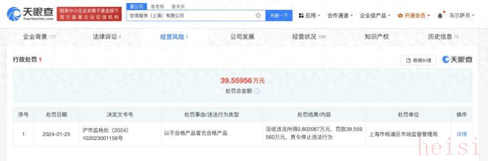 近日,記者從天眼查App獲悉,甘得服飾(上海)有限公司因以不合格產(chǎn)品冒充合格產(chǎn)品,被上海市楊浦區(qū)市場(chǎng)監(jiān)督管理局罰款39.5萬(wàn)余元、沒(méi)收違法所得8000余元。