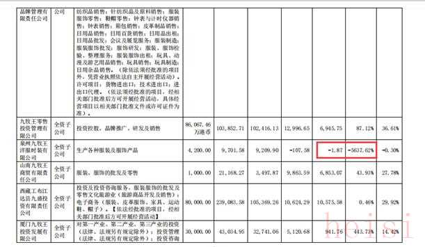 泉州九牧王洋服時裝有限公司,為九牧王全資子公司,2020年的凈利潤為-107.58萬元,2019年的凈利潤為-1.87萬元;