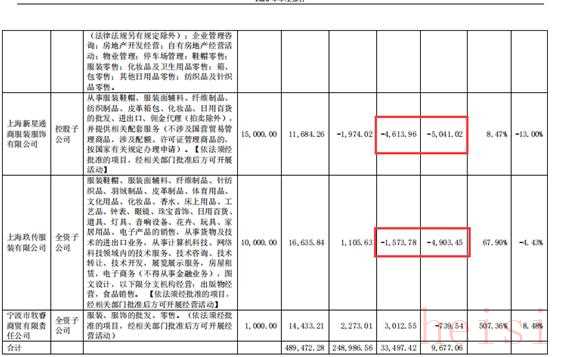 上海新星通商服裝服飾有限公司,為九牧王控股子公司,2020年的凈利潤為-4,613.96萬元,2019年的凈利潤為-5,041.02萬元;