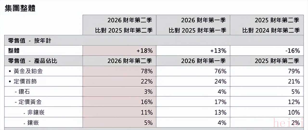 7-9月,此類別零售值的增幅高達(dá)40%,零售占比為15%;論同店銷售,漲幅更達(dá)49%,尤其鑲嵌定價(jià)黃金產(chǎn)品,增長(zhǎng)100%。