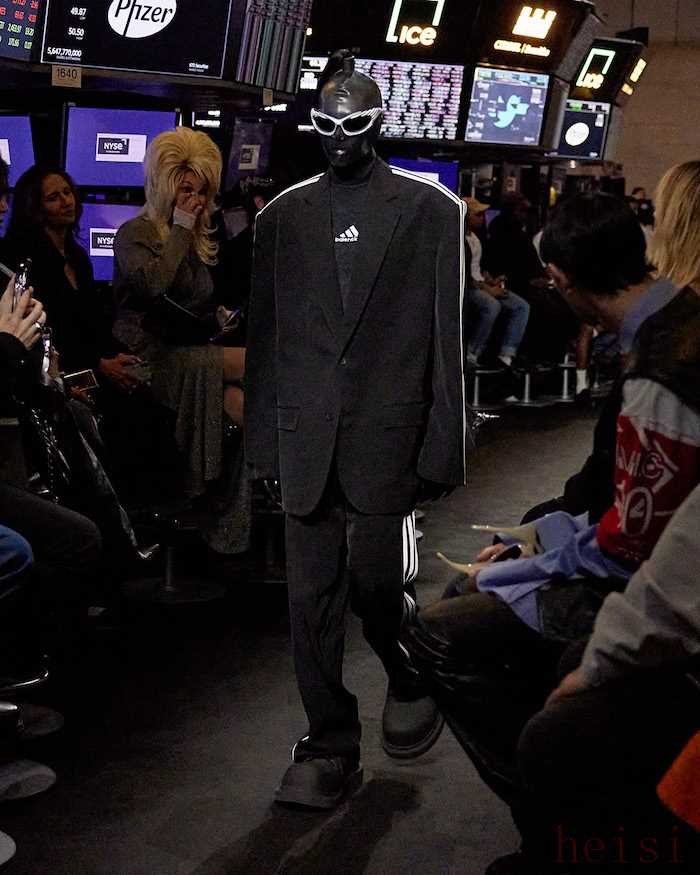 5月22日,Balenciaga 春季 23 系列于紐約證券交易所的交易大廳發(fā)布。秀場(chǎng)模特們用充滿神秘感的乳膠連體衣包裹全身,外層身著春季 23 系列,詮釋全新 Garde-Robe 系列、晚裝系列和 Balenciaga / adidas 系列成衣。