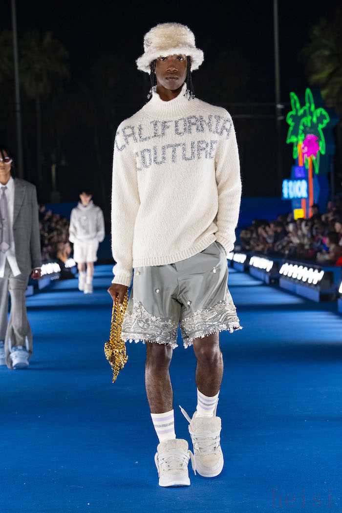 本系列不僅展現(xiàn)出設(shè)計(jì)師的個(gè)人風(fēng)格,更將克里斯汀·迪奧先生(CHRISTIAN DIOR)及其繼任者的作品融匯其中。林茲在加州威尼斯出生長(zhǎng)大,他將本土的歷史文化融入服飾設(shè)計(jì)之中。潮流文化為品牌經(jīng)典圖案注入活力,例如緞面藤格紋圖案、絎縫皮革滑板運(yùn)動(dòng)鞋,以及精致華麗的水晶裝飾長(zhǎng)褲。
