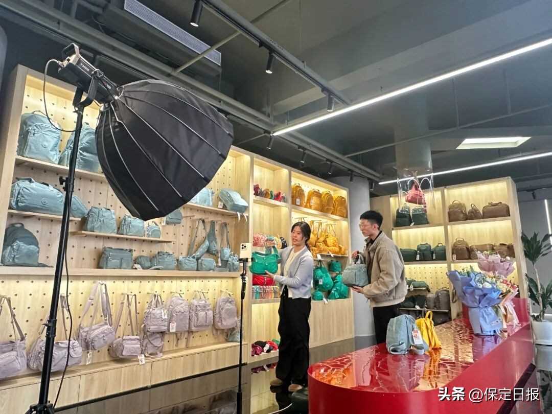 白溝新城博卜箱包企業(yè)工作人員通過直播銷售女士背包。 馮云 攝