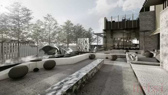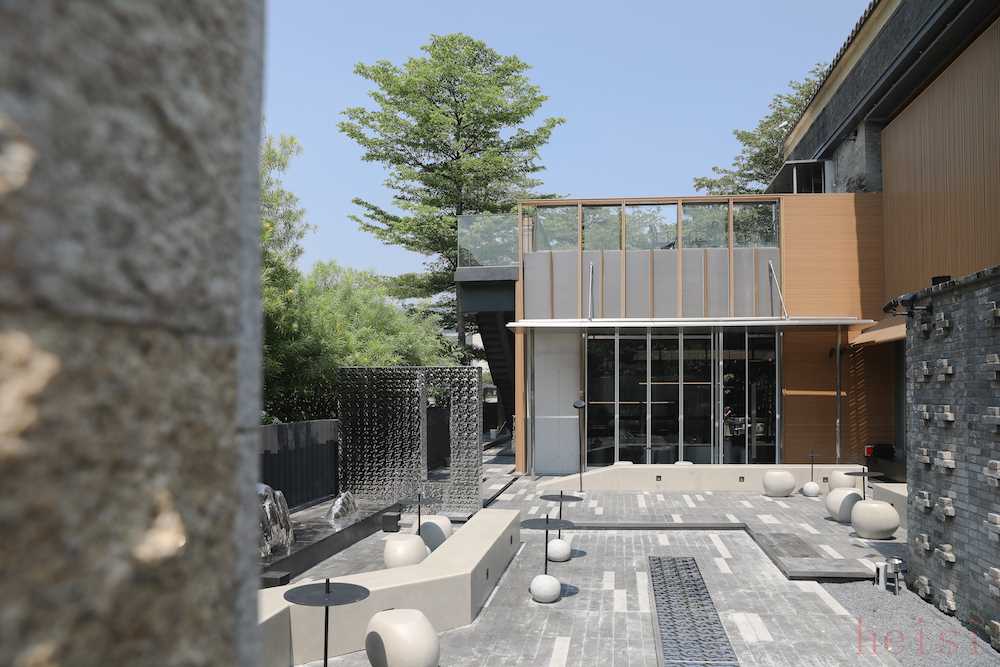 室外自由布局的游廊庭院,現(xiàn)代靈感與傳統(tǒng)文化的融合在此得以淋漓盡致地表達。座椅跟隨道路的流線圓滑曲折,鏡面與路旁樹影形成虛實景觀。盞茶氤氳間,捕捉光線每個細微的變化,于此地安放疲憊心靈,獲得片刻安寧與舒心。