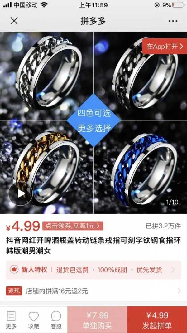 小胡買的這款戒指拼單購(gòu)買價(jià)是4.99元,有四色可選,名字也挺炫酷——