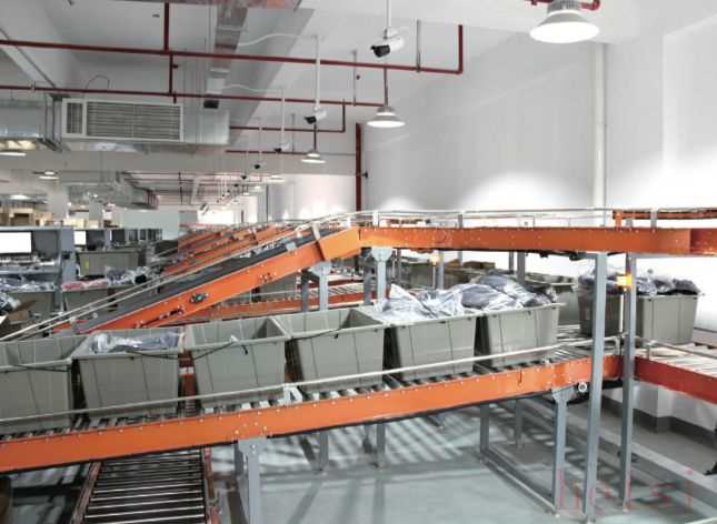 另一個(gè)難題是退貨處理。男裝銷售的一大特點(diǎn)是門店大量鋪貨,目的是為消費(fèi)者提供更多選擇,提高產(chǎn)生訂單的幾率,但這種做法也導(dǎo)致了大量的退貨。這一現(xiàn)象在聯(lián)營(yíng)男裝品牌中尤為突出。特別是每年4~5月份的冬裝退貨數(shù)量巨大,給物流帶來(lái)很大挑戰(zhàn)。為了解決這一難題,沈金輝借鑒了拉夏貝爾的經(jīng)驗(yàn),嘗試用交叉帶分揀機(jī)處理退貨,成功將處理效率提高了一倍。交叉帶分揀機(jī)能連續(xù)、大批量地分揀貨物,每小時(shí)可分揀12000件包裝商品,是人工作業(yè)效率的80倍,而且誤差率極低,大大降低員工勞動(dòng)強(qiáng)度。同時(shí),分揀機(jī)采用架高設(shè)計(jì),在設(shè)備下方節(jié)約出大量空間用來(lái)進(jìn)行貨品暫存。