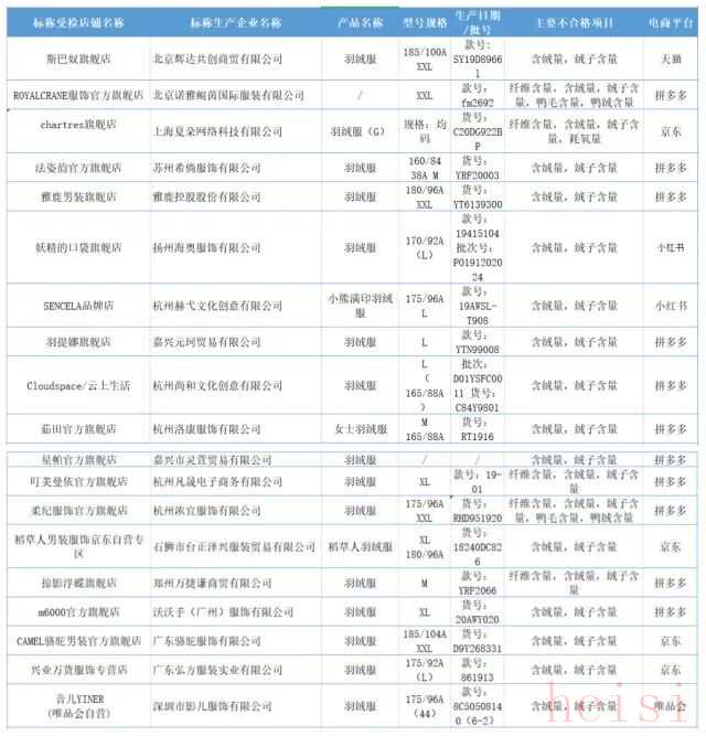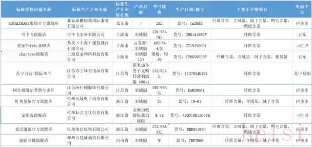 其中,不合格產(chǎn)品包括:斯巴奴旗艦店在天貓平臺上銷售的標稱北京輝達共創(chuàng)商貿(mào)有限公司生產(chǎn)的羽絨服(款號: SY19D8966l)雅鹿男裝旗艦店在拼多多平臺上銷售的標稱雅鹿控股股份有限公司生產(chǎn)的羽絨服(貨號:YT6139300)chartres旗艦店在京東平臺上銷售的標稱上海夏朵網(wǎng)絡科技有限公司生產(chǎn)的羽絨服(G)(貨號:C20DG922BP)稻草人男裝服飾京東自營專區(qū)在京東平臺上銷售的標稱石獅市臺正澤興服裝貿(mào)易有限公司生產(chǎn)的稻草人羽絨服(貨號:18240DC826)妖精的口袋旗艦店在小紅書平臺上銷售的標稱揚州海奧服飾有限公司生產(chǎn)的羽絨服(款號:19415104 批次號:PO191202024)音兒YINER(唯品會自營)在唯品會平臺上銷售的標稱深圳市影兒服飾有限公司生產(chǎn)的羽絨服(款號:8C50508140(6-2))纖維含量是消費者最關注的產(chǎn)品信息,錯標亂標纖維含量,容易誤導消費者。本次抽查中有10批次產(chǎn)品纖維含量項目不合格。