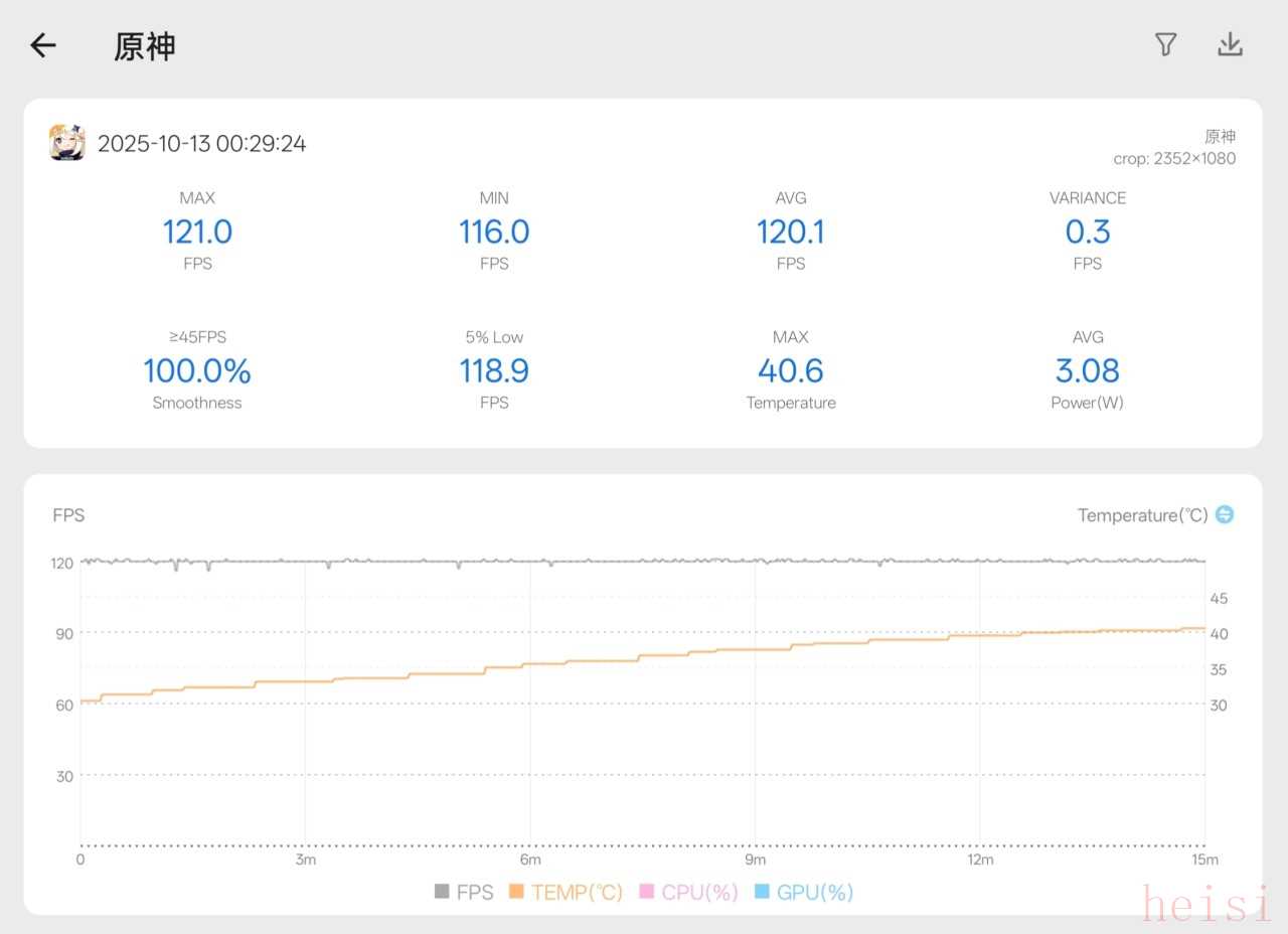 再看看超分+插幀后的《原神》,在2K+120Hz的情況下,平均幀率來到120.1幀,平均功耗3.08W,溫度倒是很快就上升到42°C左右,進(jìn)行約25分鐘游戲后,會(huì)提醒無法繼續(xù)超分+插幀并行,但是依然能夠保持高幀率。