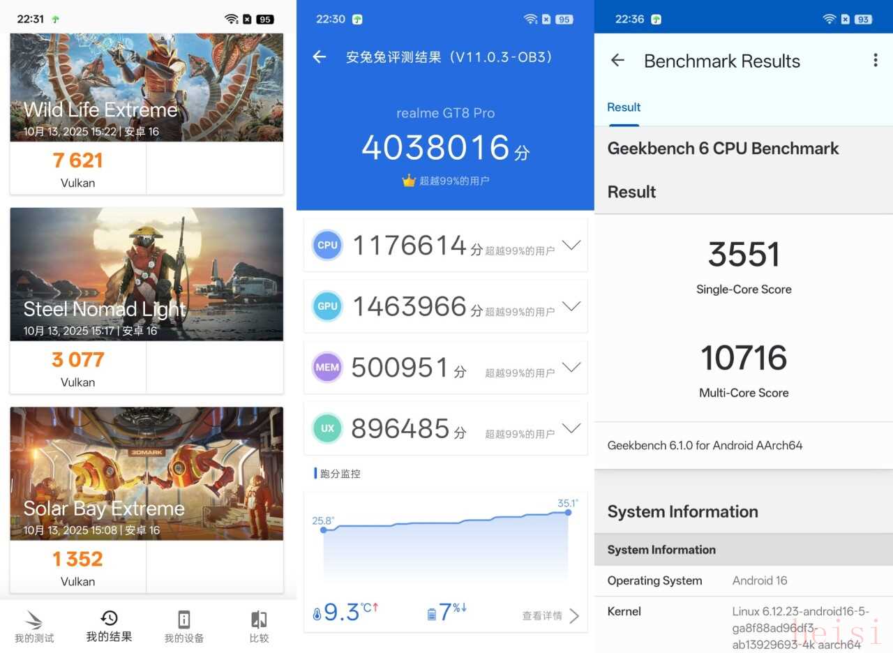 從跑分來看,真我GT8 Pro的性能釋放相當(dāng)激進(jìn),無論是CPU的理論運(yùn)算能力還是GPU的圖形渲染能力,都穩(wěn)穩(wěn)站在了第一梯隊(duì),甚至是目前少有的能跑到400W分以上的產(chǎn)品。