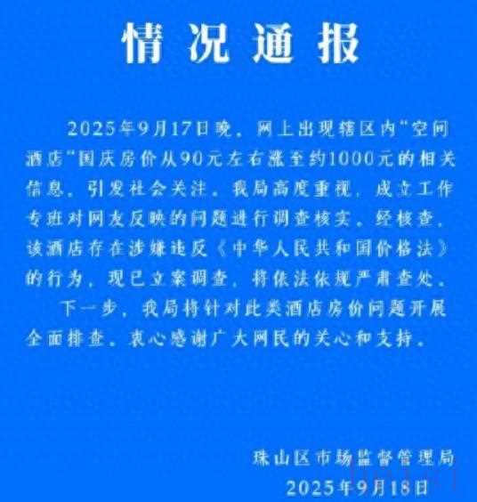 國(guó)慶假期臨近之際,多地酒店,特別是旅游景區(qū)周邊的住宿場(chǎng)所,再次出現(xiàn)價(jià)格顯著上漲現(xiàn)象,引發(fā)消費(fèi)者投訴和監(jiān)管部門介入。近期,江西景德鎮(zhèn)“空間酒店”被曝光其國(guó)慶房?jī)r(jià)從平日約90元上漲至約1000元,漲幅超過(guò)十倍。當(dāng)?shù)厥袌?chǎng)監(jiān)管局迅速立案調(diào)查,認(rèn)定其涉嫌違反《中華人民共和國(guó)價(jià)格法》,并啟動(dòng)了全面排查。