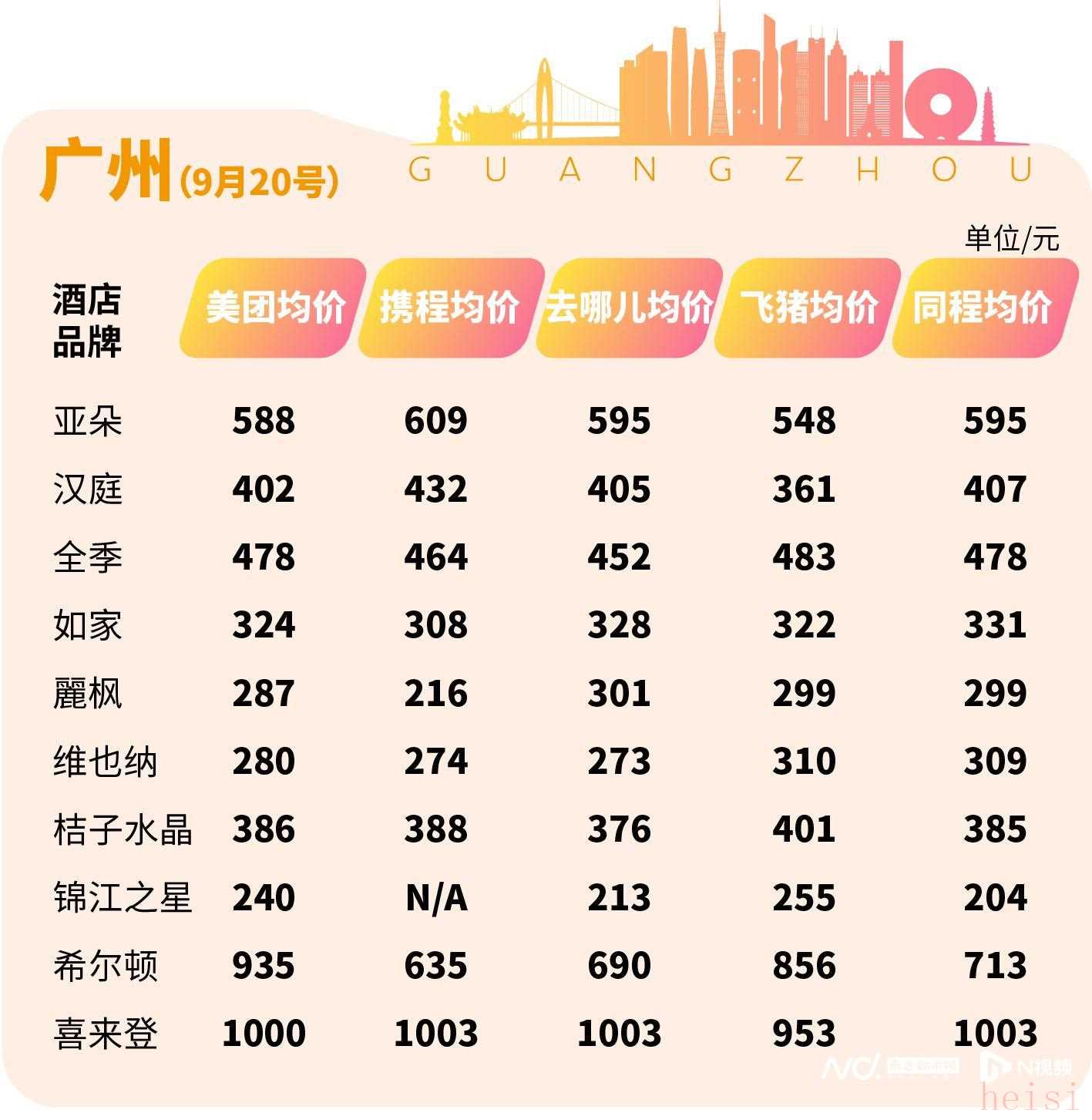 廣州酒店市場(chǎng)在國(guó)慶前夕展現(xiàn)出強(qiáng)勁的全面上漲趨勢(shì)。經(jīng)濟(jì)型和中端品牌均實(shí)現(xiàn)顯著增長(zhǎng),維也納品牌表現(xiàn)尤為突出,均價(jià)從290元大幅攀升至447元,漲幅高達(dá)54.1%。麗楓品牌同樣表現(xiàn)亮眼,從297元上漲至505元,漲幅達(dá)70.0%。亞朵品牌也實(shí)現(xiàn)47.6%的增幅至865元。值得關(guān)注的是高端市場(chǎng)的同步上揚(yáng),希爾頓均價(jià)從761元上漲至836元,漲幅9.9%;喜來(lái)登從990元升至1103元,漲幅11.4%。平臺(tái)數(shù)據(jù)進(jìn)一步印證了這種普漲態(tài)勢(shì),維也納在飛豬平臺(tái)的價(jià)格從310元躍升至509元,漲幅64.2%。