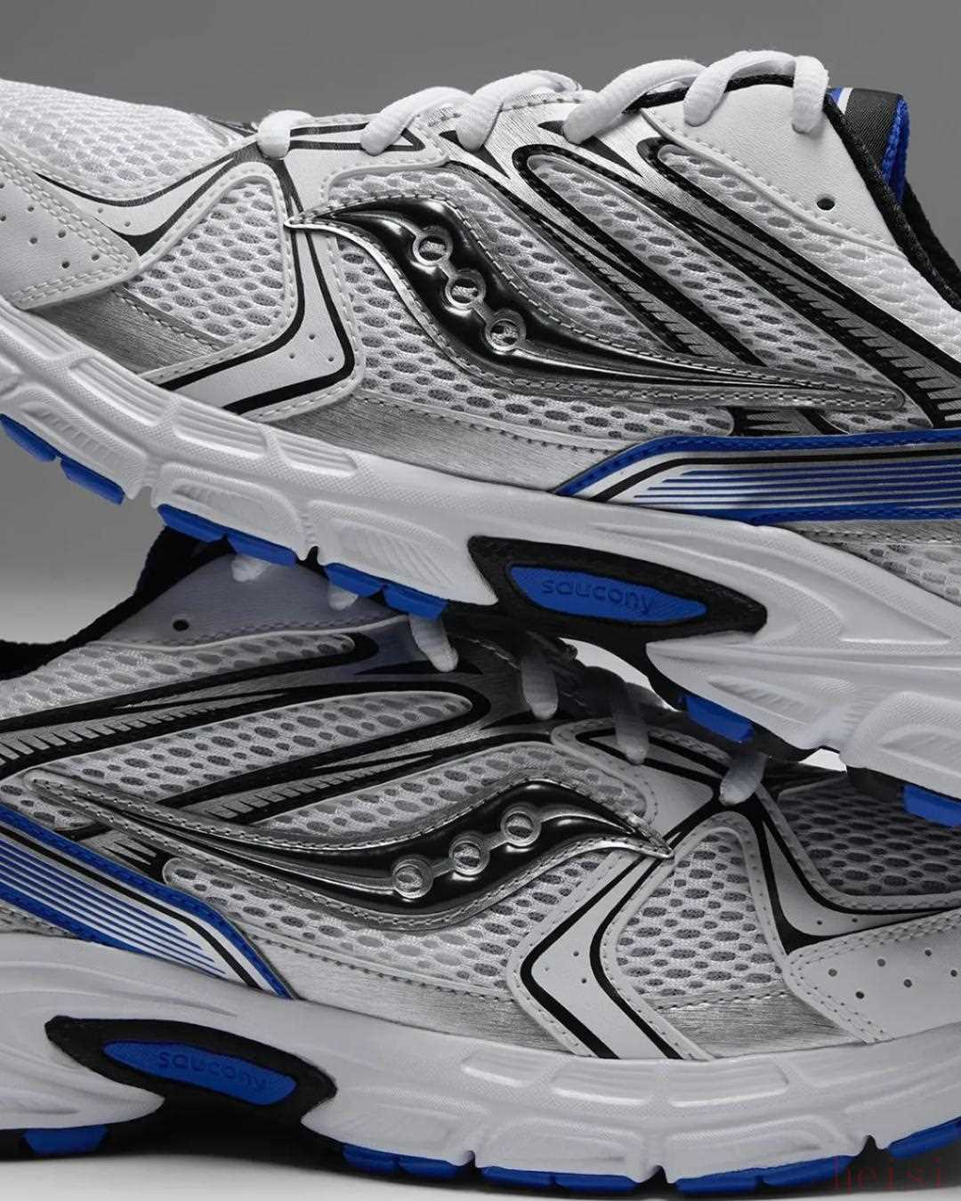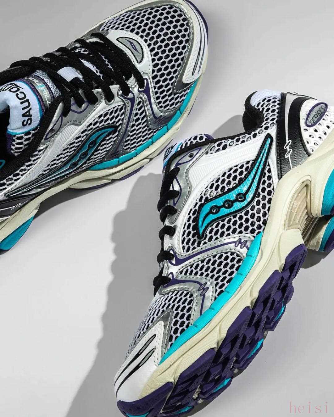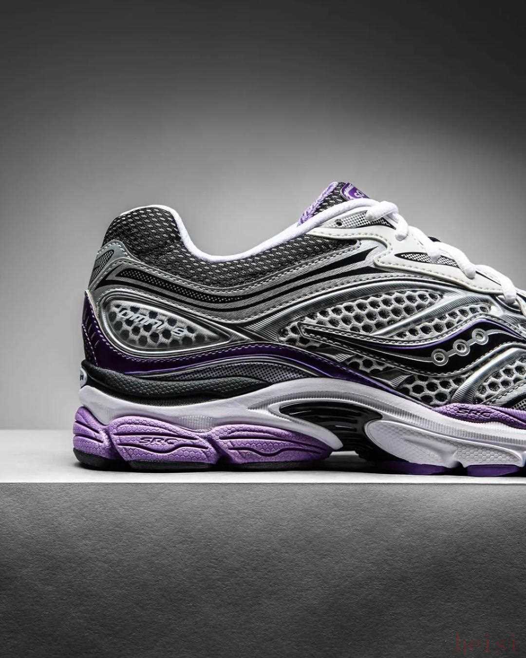 首先亮相的是索康尼ProGrid Omni 9,這款鞋因去年與 Jae Tips 的“To Do List”合作而廣為人知。閃亮的金屬銀色處理貫穿鞋面的大部分區(qū)域,為該系列的其他產(chǎn)品奠定了基調(diào)。索康尼的標志采用虹彩紫色飾面,鞋舌、中底和后跟處也點綴著更多紫色元素。接下來是ProGrid Triumph 4,它是 Saucony 系列中同樣出色的產(chǎn)品。顏色選擇更加豐富,銀色金屬色再次成為鞋底的亮點,中底則略帶棕褐色,營造出復(fù)古氣息。Saucony Ride Millennium 是價格更親民的一款,這款鞋摒棄了其他鞋款的黑/銀配色,而是采用了白色網(wǎng)眼、金屬覆層,并在鞋舌、后跟和中底上點綴了寶藍色。