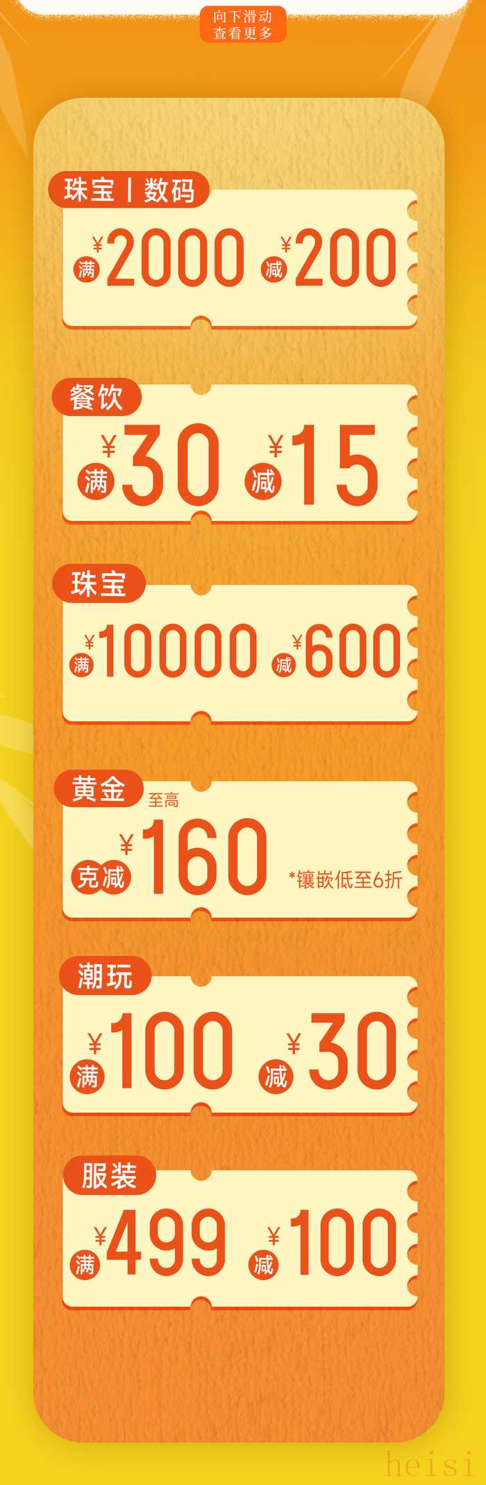 超值滿減享不停:珠寶/數(shù)碼滿2000元減200元;餐飲滿30元減15元;黃金克減至高160,鑲嵌低至6折;潮玩滿100元減30元;服裝滿499元減100元。
