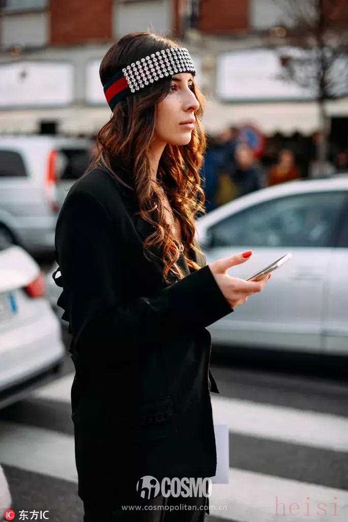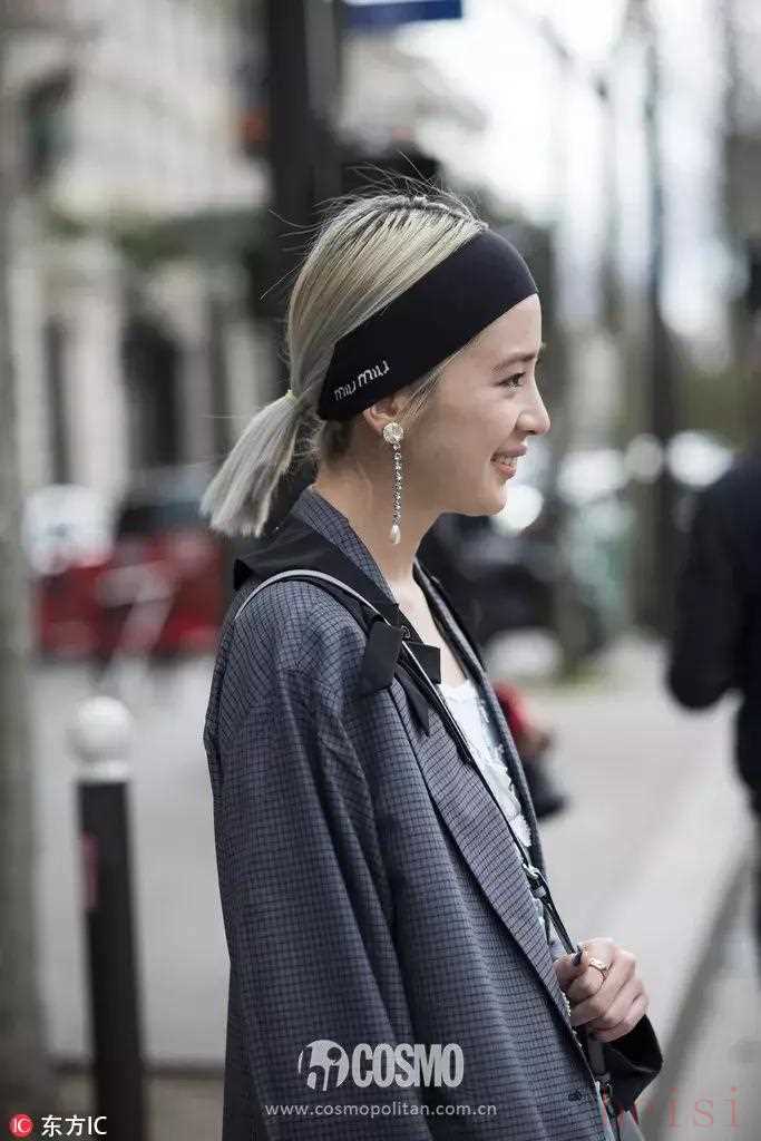 她屬于隨意性,將發(fā)帶撐在后腦勺,往前一套,戴至眉峰,留出鬢角和后面的頭發(fā),即可成行。不用整理劉海和周遭的頭發(fā),輕松隨意。