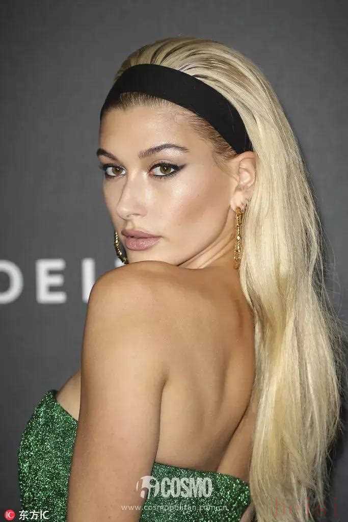 Hailey Baldwin在今年參加Met Gala選擇用發(fā)帶搭配綠色金蔥禮服。