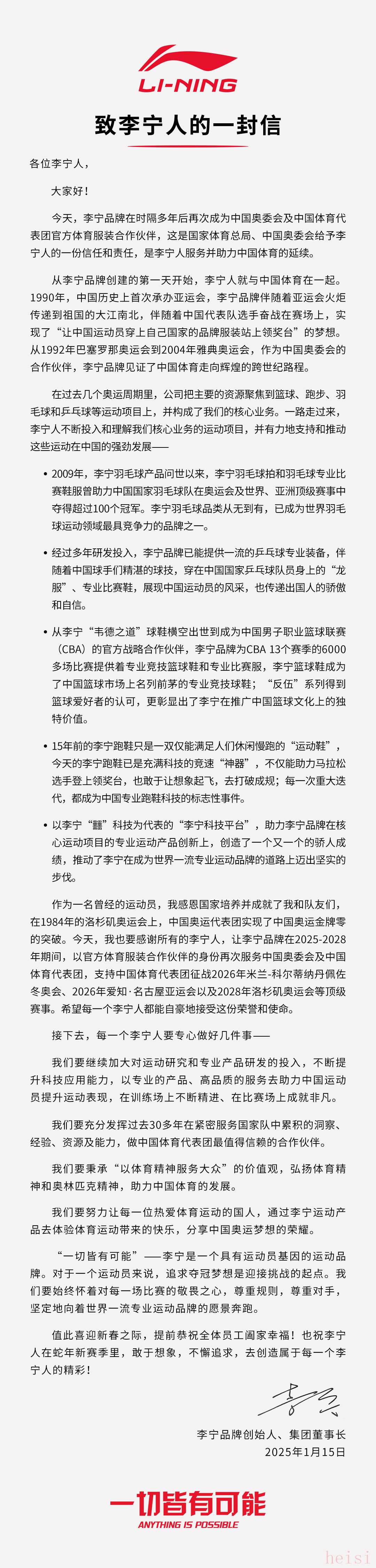 李寧本人在信中表示:“在過(guò)去幾個(gè)奧運(yùn)周期,李寧公司把主要的資源聚焦到籃球、跑步、羽毛球和乒乓球等運(yùn)動(dòng)項(xiàng)目上,并構(gòu)成其核心業(yè)務(wù),推動(dòng)了這些運(yùn)動(dòng)在中國(guó)的強(qiáng)勁發(fā)展。”