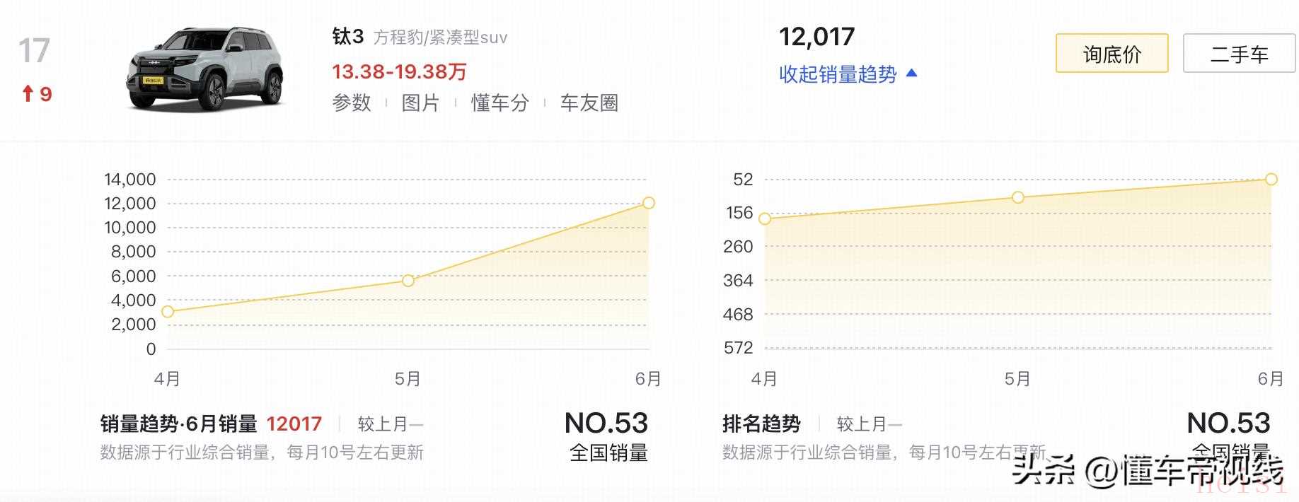 根據(jù)銷(xiāo)量數(shù)據(jù)顯示,今年6月,鈦3銷(xiāo)量為12017輛,位列當(dāng)月純電動(dòng)車(chē)銷(xiāo)量榜單第17位。在同價(jià)位車(chē)型當(dāng)中,鈦3的競(jìng)爭(zhēng)對(duì)手包括smart精靈#3(指導(dǎo)價(jià)16.49萬(wàn)元起)、極氪X(指導(dǎo)價(jià)14.90萬(wàn)元起)、上汽大眾ID.4 X(指導(dǎo)價(jià)15.9888萬(wàn)元起)等。更多消息,懂車(chē)帝將持續(xù)關(guān)注。