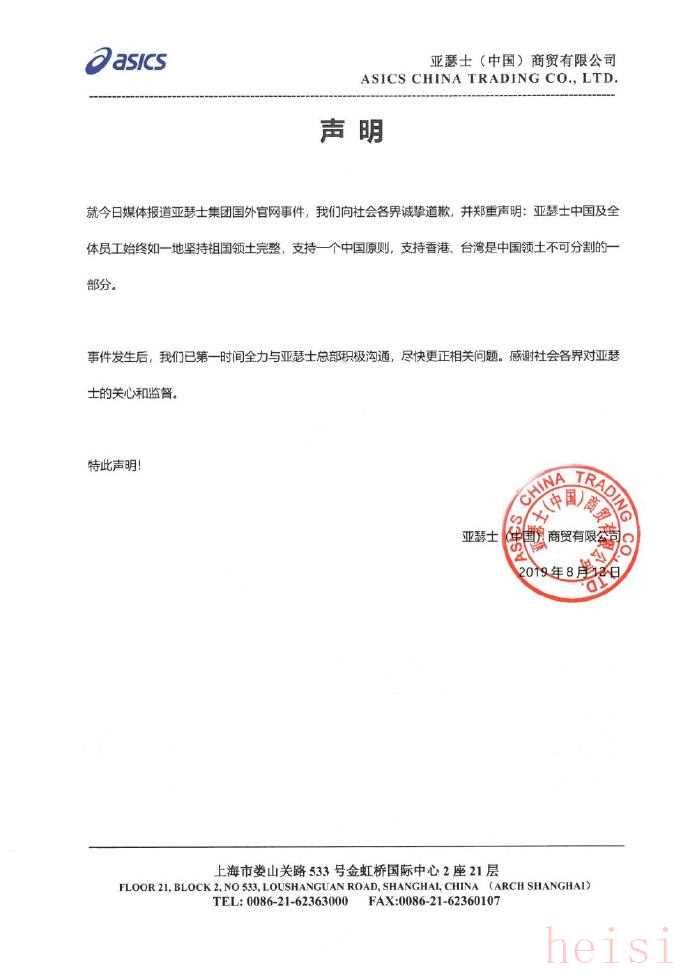 目前,亞瑟士中國就集團國外官網(wǎng)將香港、臺灣列為“國家”一事發(fā)布道歉聲明:亞瑟士中國及全體員工始終如一地堅持祖國領(lǐng)土完整,支持一個中國原則,支持香港、臺灣是中國領(lǐng)土不可分割的一部分。 事件發(fā)生后,已第一時間全力與亞瑟士總部積極溝通,盡快更正相關(guān)問題。