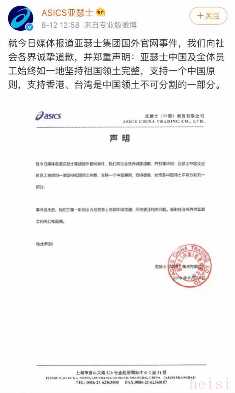 南都記者發(fā)稿前,亞瑟士中國區(qū)品牌代言人江疏影、李治廷及其工作室暫未就此事進行回應,亞瑟士方面在今日中午1點左右進發(fā)布聲明,聲稱“支持一個中國原則,支持香港、臺灣是中國領土不可分割的一部分”。
