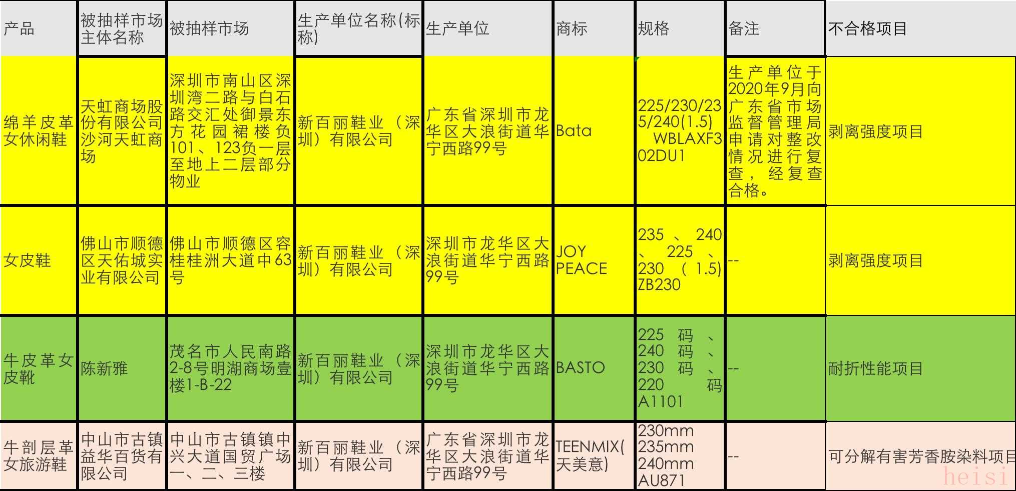 抽查結果顯示,新百麗鞋業(yè)(深圳)有限公司生產的4批次產品上榜。其中,Bata1批次綿羊皮革女休閑鞋與JOY PEAC(真美詩)1批次女皮鞋剝離強度項目不合格。剝離強度項目主要考核產品鞋幫與鞋底結合牢度。該項目不合格,將影響消費者對產品的正常穿著,產品在短時間內造成黏膠部位出現(xiàn)開膠脫膠現(xiàn)象。2批次產品中,生產單位新百麗鞋業(yè)(深圳)有限公司生產,于2020年9月向廣東省市場監(jiān)督管理局,申請對整改情況進行復查。經復查,Bata綿羊皮革女休閑鞋合格。
