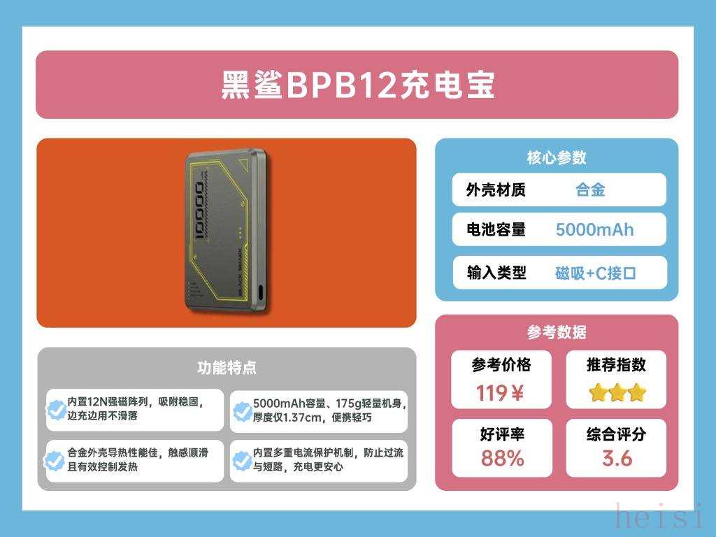 品勝這款是傳統(tǒng)造型,有雙 USB-A 和 1 個(gè) USB-C 接口,能同時(shí)充 3 臺設(shè)備,儲電靠 USB-C 輸入。20000mAh 大容量,額定容量滿足一天外出用電,自充最快 4 小時(shí)充滿,速度不慢。最高 22.5W 輸出,兼容多種快充協(xié)議,還支持 PD20W 快充,給蘋果 16 充電 30 分鐘到 46%,省時(shí)間。符合航空規(guī)定,能帶上飛機(jī),LED 數(shù)顯能清晰看電量。但重量 319g,超過 300g 偏沉,機(jī)身沒掛繩設(shè)計(jì),單獨(dú)手持出門不太方便,更適合放包里攜帶。7黑鯊BPB12品牌知名度:★★☆☆☆