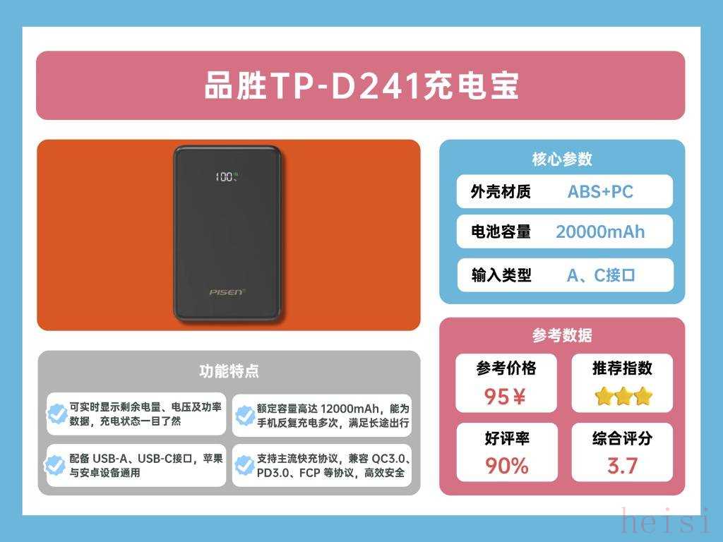 飛利浦這款 10000mAh 容量,額定容量 6000mAh,續(xù)航給力,且體積和銀行卡差不多,重量才 180g,便攜性拉滿,放口袋毫無壓力。自帶 Type-C 和 Lightning 兩條線,出門不用找充電器,線還能隨手拎著,實(shí)用性很高。機(jī)身有智能顯示屏,剩余電量數(shù)字清晰,不用猜電量。配色有 4 種清新款,小巧機(jī)身卻功能全,堪稱 “五臟俱全”。充電支持 22.5W 超級快充,用自帶線給華為 Mate60 充電,30 分鐘充到 42%,同體積款里速度算出色的。6品勝TP-D241品牌知名度:★★☆☆☆