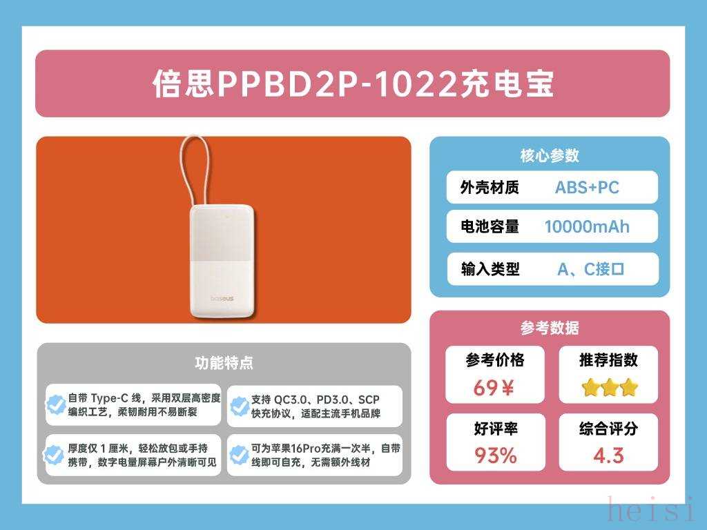 安克這款核心亮點(diǎn)是 “充電寶 + 充電器 + 快充線” 三合一,單手握持就能帶走,三種功能合一,對怕麻煩的人很友好。配色有 5 種,都是清新可愛的風(fēng)格,顏值比較討喜。容量 5000mAh,額定容量 3000mAh,只能應(yīng)急補(bǔ)電。充電線可選 Type-C 或 Lightning,側(cè)面曲面清透面板觸感好,LED 視窗能實(shí)時(shí)看電量,很直觀。內(nèi)置冰鋒循環(huán)散熱系統(tǒng),充放電時(shí)熱量散得快,不會太燙。但缺點(diǎn)也明顯,5000mAh 容量賣近 200 元,比 10000mAh 款還貴,且最高 7.5W 功率,充電速度偏慢,更適合剛需 “三合一” 功能的用戶。4倍思PPBD2P-1022品牌知名度:★★★☆☆