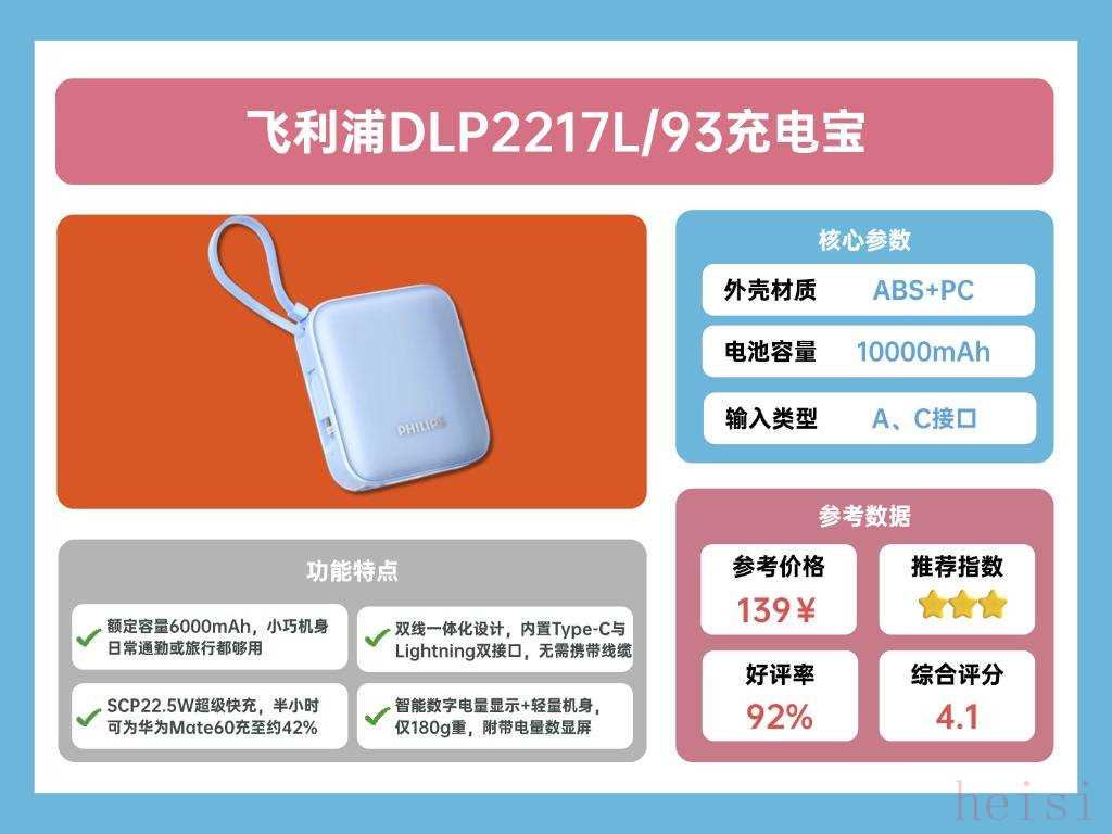 倍思這款自帶 Type-C 線,線用了新一代雙層高密度編織工藝,比普通 PVC 線耐造,不容易斷,使用壽命更長。輸入支持 USB-C、USB-A 和自帶線三種方式,還兼容 QC3.0、PD3.0 等快充協(xié)議,主流手機(jī)都能充。自充時(shí)直接用自帶線就行,不用額外備線,很方便。厚度僅 1 厘米多,比同類型薄不少,放包里幾乎沒存在感,拎著編織線出門也輕松。正面拋光 UV 鏡片,強(qiáng)光下看電量數(shù)字也清晰,不用擋陽光。實(shí)測給蘋果 16Pro 充電,滿電可充 1 次 + 70%,30 分鐘充到 55%,速度夠用。5飛利浦DLP2217L/93品牌知名度:★★☆☆☆