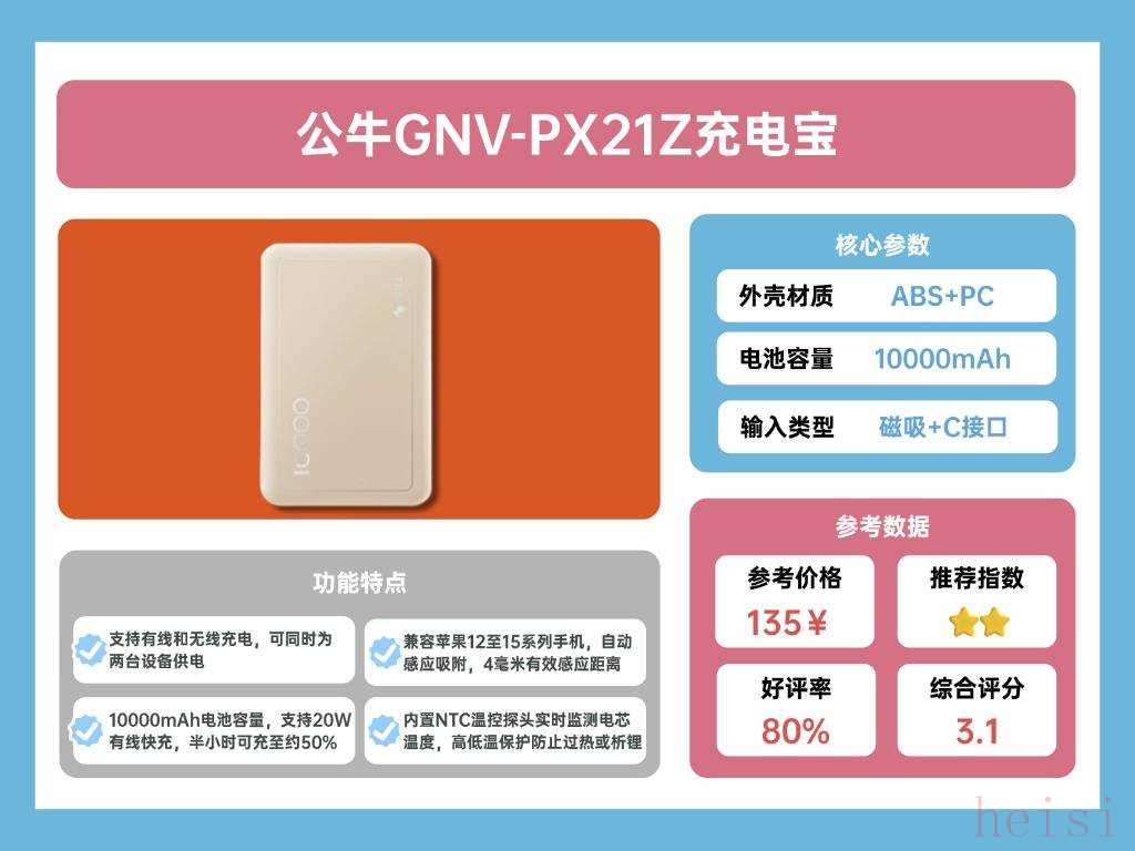 綠聯(lián)這款有 20W 和 30W 兩個(gè)版本,30W 款速度快 5%-10%,但貴 30 元且稍重,下面說 20W 款。采用力神電芯,力神是國內(nèi)電池領(lǐng)先企業(yè),品質(zhì)可靠。支持磁吸充電,給蘋果手機(jī)充會出官方動畫,體驗(yàn)好,17 顆 N52 磁芯 + 防滑硅膠,吸力強(qiáng),不會一甩就掉。內(nèi)置石墨烯和自研溫控系統(tǒng),能智能調(diào)功率。除磁吸外還支持 USB-C 輸入,可充非磁吸手機(jī),但沒自帶充電線,用 USB-C 口需自己備線,稍顯不便。10公牛GNV-PX21Z品牌知名度:★★☆☆☆