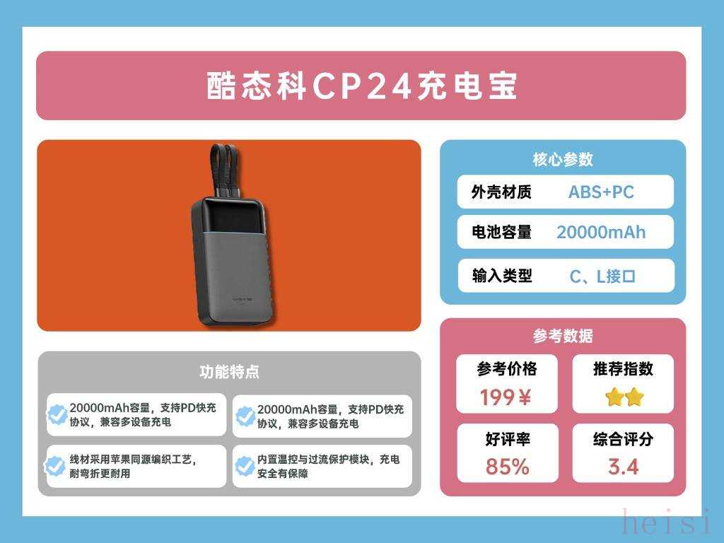 黑鯊這款用合金材質(zhì),機(jī)能風(fēng)外觀簡約,商務(wù)人士和追求時(shí)尚的人都適合。12N 強(qiáng)力磁芯陣列,吸附力強(qiáng),充電時(shí)不易滑落,不用頻繁調(diào)整位置。機(jī)身厚 1.37cm、重 175g,輕薄便攜,尺寸不擋手機(jī)攝像頭,使用不影響。采用黑鯊 NTC 控溫技術(shù),測溫智能,充電不發(fā)熱,安全性高。電芯和蘋果同款鈷酸鋰,穩(wěn)定性、抗沖擊力好,低溫性能也佳。10000mAh 容量,額定容量 6000mAh,30 分鐘給蘋果 15 充到 50%,速度中等,價(jià)格不到 140 元,性價(jià)比不錯。8酷態(tài)科CP24電能塊品牌知名度:★★☆☆☆