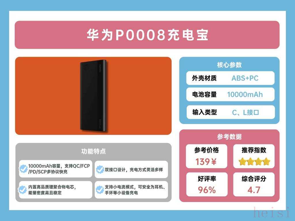 雖然西圣PB充電寶機(jī)身小巧,但它擁有10000mAh超大的電池容量,搭配了新能源汽車同款的126280鋰離子聚合物電芯,支持15W無線磁吸快充與最高20W自帶線/有線快充,充電速度是市面部分共享充電寶的2倍,對于絕大多數(shù)用戶來說,已經(jīng)足夠應(yīng)對一天甚至更長時(shí)間的正常使用需求。此外,該充電寶長按開關(guān)進(jìn)入低電流模式,AirPods等無線藍(lán)牙耳機(jī)也能充。2華為P0008品牌知名度:★★★★☆