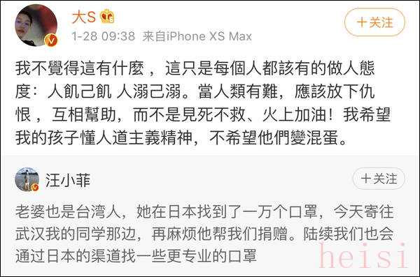 汪小菲1月27日發(fā)文表示,其妻子,臺(tái)灣藝人大S在日本購買了1萬個(gè)口罩,將寄往武漢同學(xué)處作為捐贈(zèng)物資。