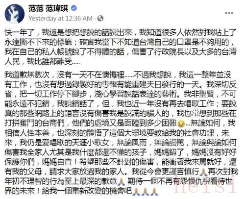 我道歉無數(shù)次,沒有一天不活在懊悔里……不過我想說,我這一整年并沒有工作,也沒有想過錄制好的專輯有重建天日發(fā)行的一天。我深切反省,把一切工作停下腳步,虛心學習說話和表達的藝術。我非圣賢,不可能永遠不犯錯,我說錯話了,但,我也沒有再去唱歌工作。要說真的那些攻擊我的人沒有傷害我是說謊的,騙人的,我也常想到那些在打拼奮斗的臺商們,他們的處境又是面臨到多少困難……無論如何,我相信人性本善,也深刻的體悟了這個大環(huán)境要教給我的社會功課,未來,我應該仍會是那個愛唱歌的天涯小歌女。無論風雨,無論謾罵,無論輿論如何傷害我全家人尤其是我什么都還不懂的孩子...媽媽錯了,媽媽沒有好好保護你們,媽媽自責!希望那些不針對的傷害,能沖著我來罵就好,還有我的父母,請求大家放過我的家人。我從今會更謹言慎行,再次對我年初不理智的言行至上最深的歉意,期待一個不再用怨恨仇視看待世界的未來!也請給我一個重新改變的機會吧~