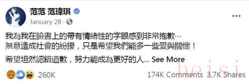 但質疑聲并未停止,此后,范瑋琪多次在臉書和Instagram發(fā)文道歉。